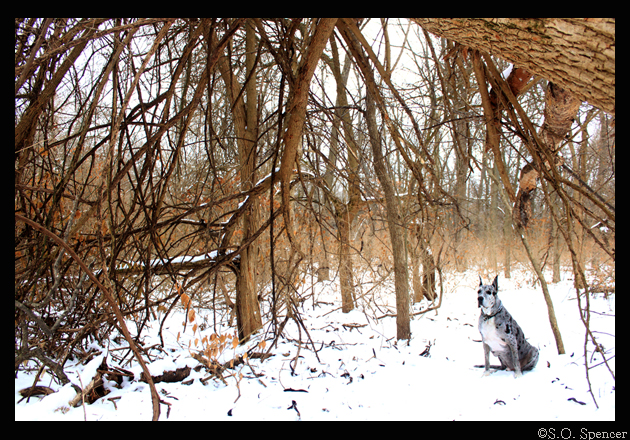 On a completely different note, my dear friend M’s dog died on Friday. He was a Great Dane and incredibly cool. He was 11, which is very old for giant breeds, and he had a good life with M, but that doesn’t make it any easier. I went on a walk with them a few weeks ago and took my camera with me. I took this picture of him in the snow. I’ve already made a print of it for her.