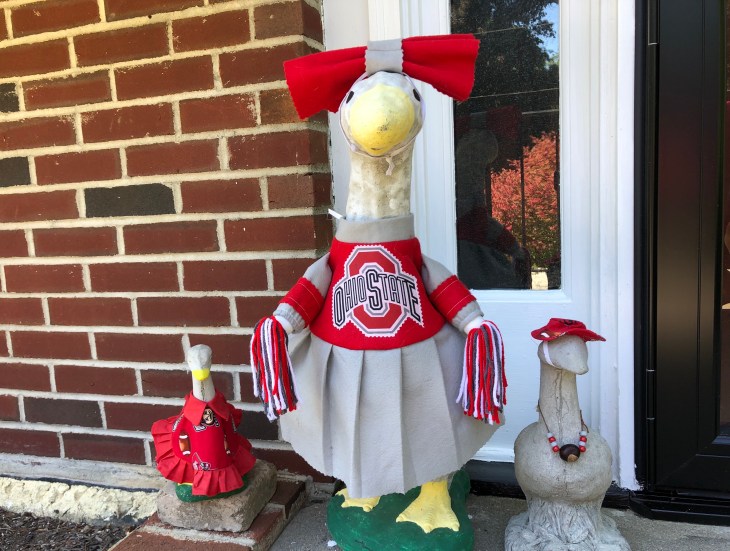 Somewhere along the way she adopted a third goose, another small one. At her request, during two separate visits, I had painted the other two geese, transforming them from gray cement to the more believable versions with yellow bills and webbed feet. I don’t know when the third one joined the family, but I did not get the chance to paint him for mom. He (she?) is also the one missing the most clothes. While most of the outfits were made for the big goose, when she took on the smaller goose, mom made many matching outfits. This third goose, unpainted and naked most of the time, is like the “red-headed stepchild” of the trio. But I’m sure he had clothes when he was at mom’s house. She wouldn’t have let him on the porch with the others without proper dressing.