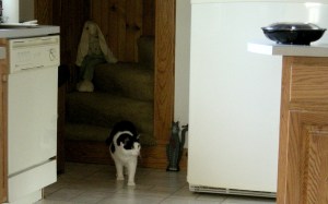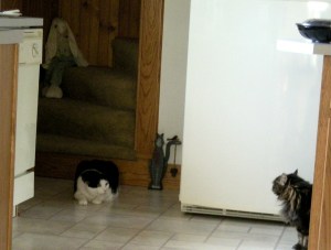 The cats didn’t make a peep on the drive. I was impressed with their calmness and the fact that they didn’t have any accidents in their carrier. There’s been a lot of hissing and yowling here at mom’s house as her two cats try to defend their territory and my cats try to claim unclaimed territory.